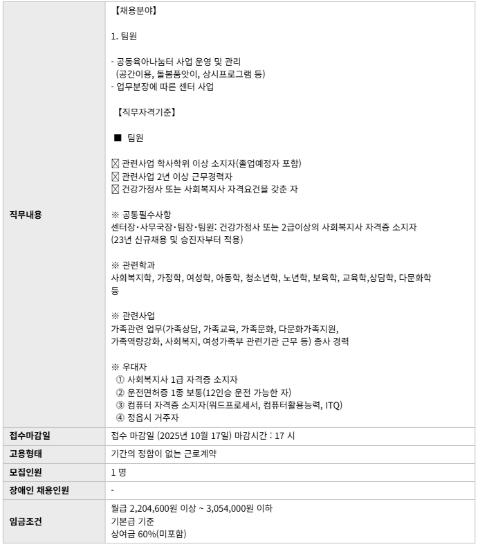 | Á¤À¾½Ã°¡Á·¼¾ÅÍ Ã¤¿ë °ø°í(°øµ¿À°¾Æ³ª´®ÅÍ Àü´ãÀηÂ) | |||