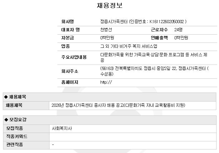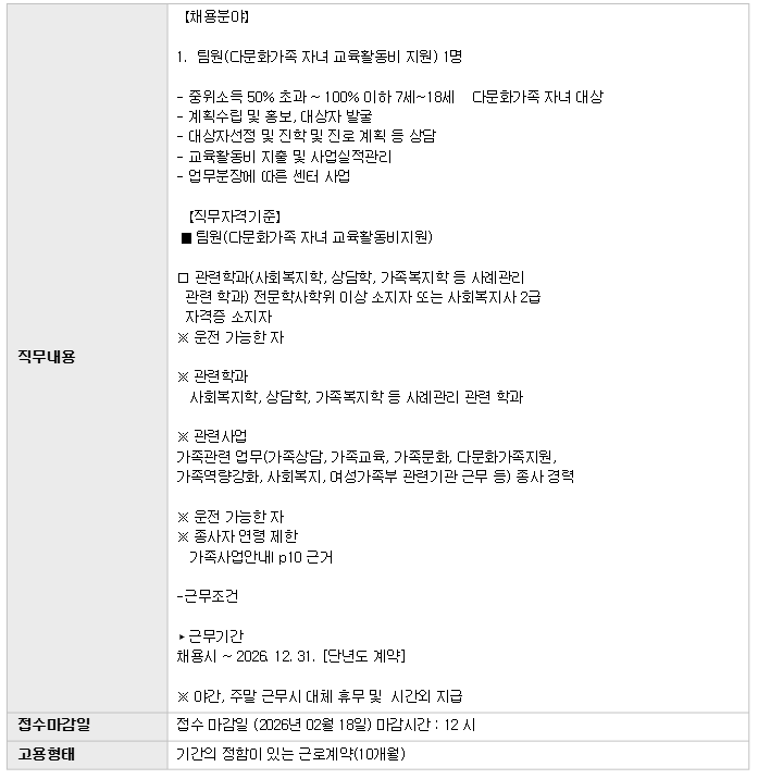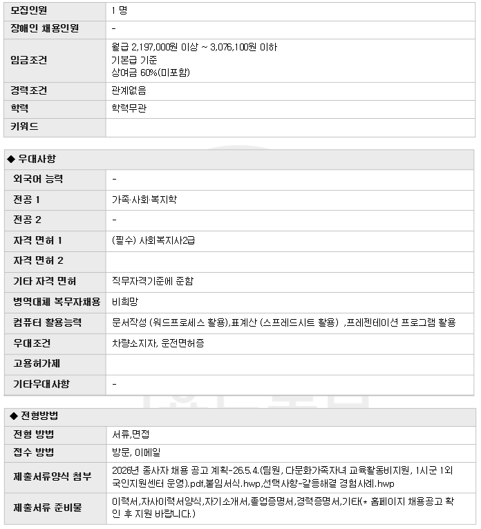 | 2026³â Á¤À¾½Ã°¡Á·¼¾ÅÍ Á¾»çÀÚ Ã¤¿ë °ø°í(´Ù¹®È°¡Á· ÀÚ³à ±³À°È°µ¿ºñ Áö¿ø) | |||