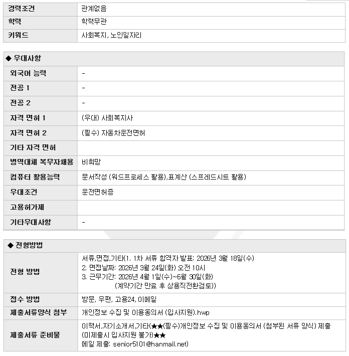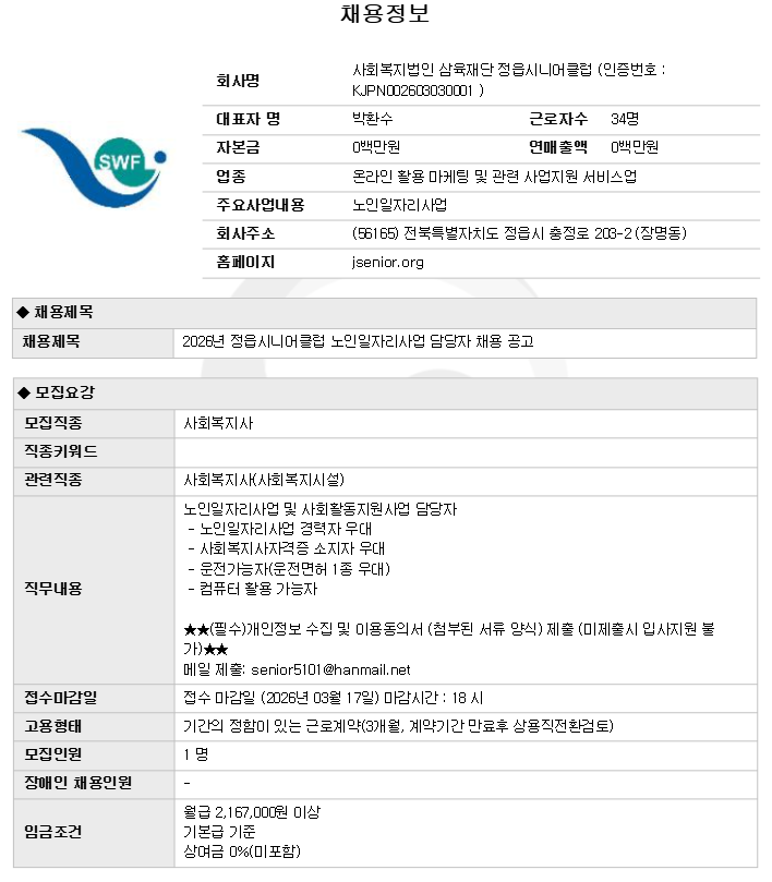 | 2026³â Á¤À¾½Ã´Ï¾îŬ·´ ³ëÀÎÀÏÀÚ¸®»ç¾÷ ´ã´çÀÚ Ã¤¿ë °ø°í | |||