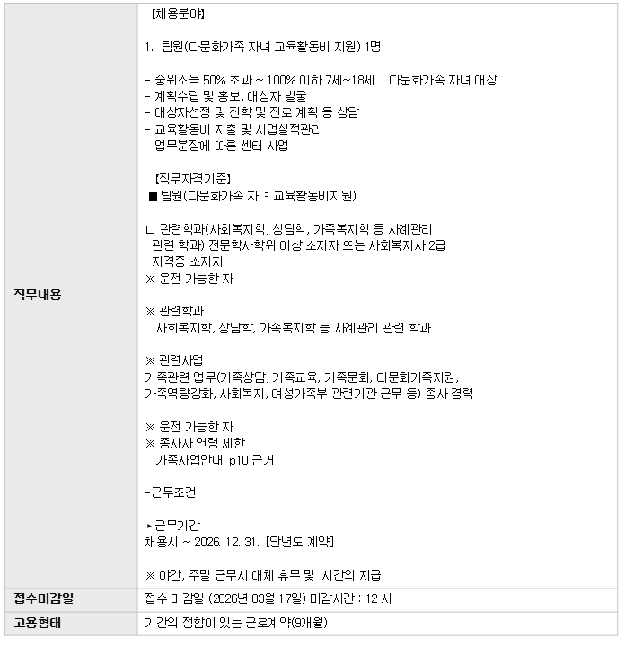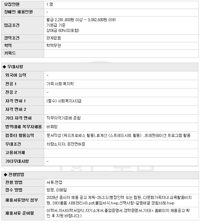 | 2026³â Á¤À¾½Ã°¡Á·¼¾ÅÍ Á¾»çÀÚ Ã¤¿ë °ø°í(´Ù¹®È°¡Á· ÀÚ³à ±³À°È°µ¿ºñ Áö¿ø) | |||