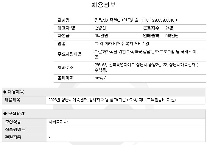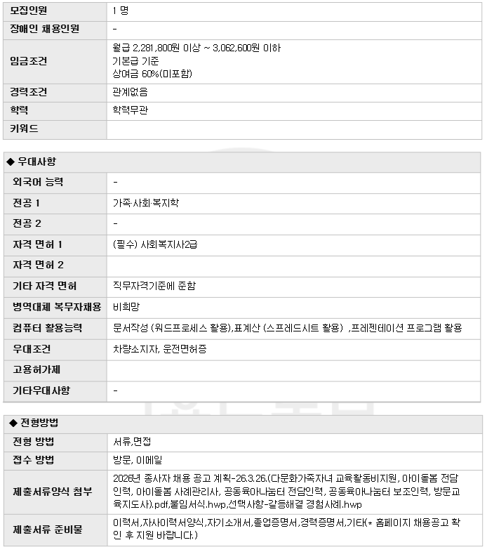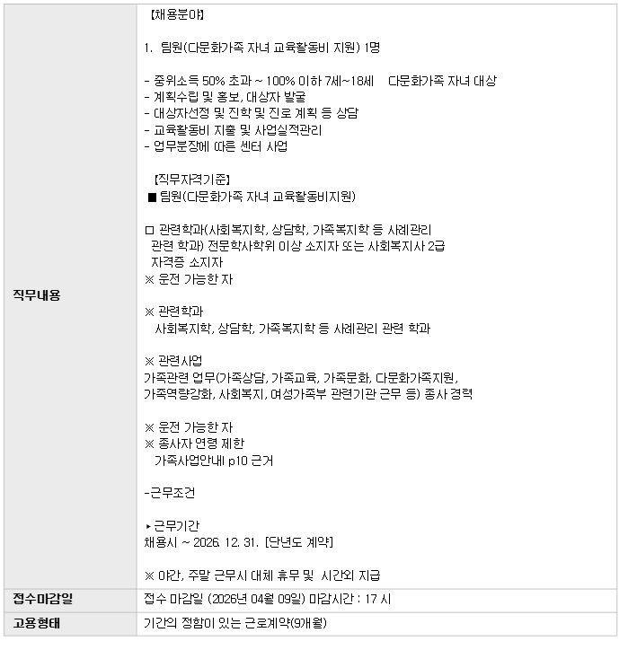 | 2026³â Á¤À¾½Ã°¡Á·¼¾ÅÍ Á¾»çÀÚ Ã¤¿ë °ø°í(´Ù¹®È°¡Á· ÀÚ³à ±³À°È°µ¿ºñ Áö¿ø) | |||