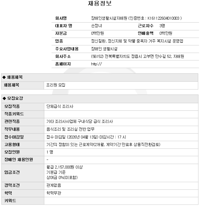 | Àå¾ÖÀλýȰ½Ã¼³ÀÚ¾Ö¿ø Á¶¸®¿ø ¸ðÁý | |||